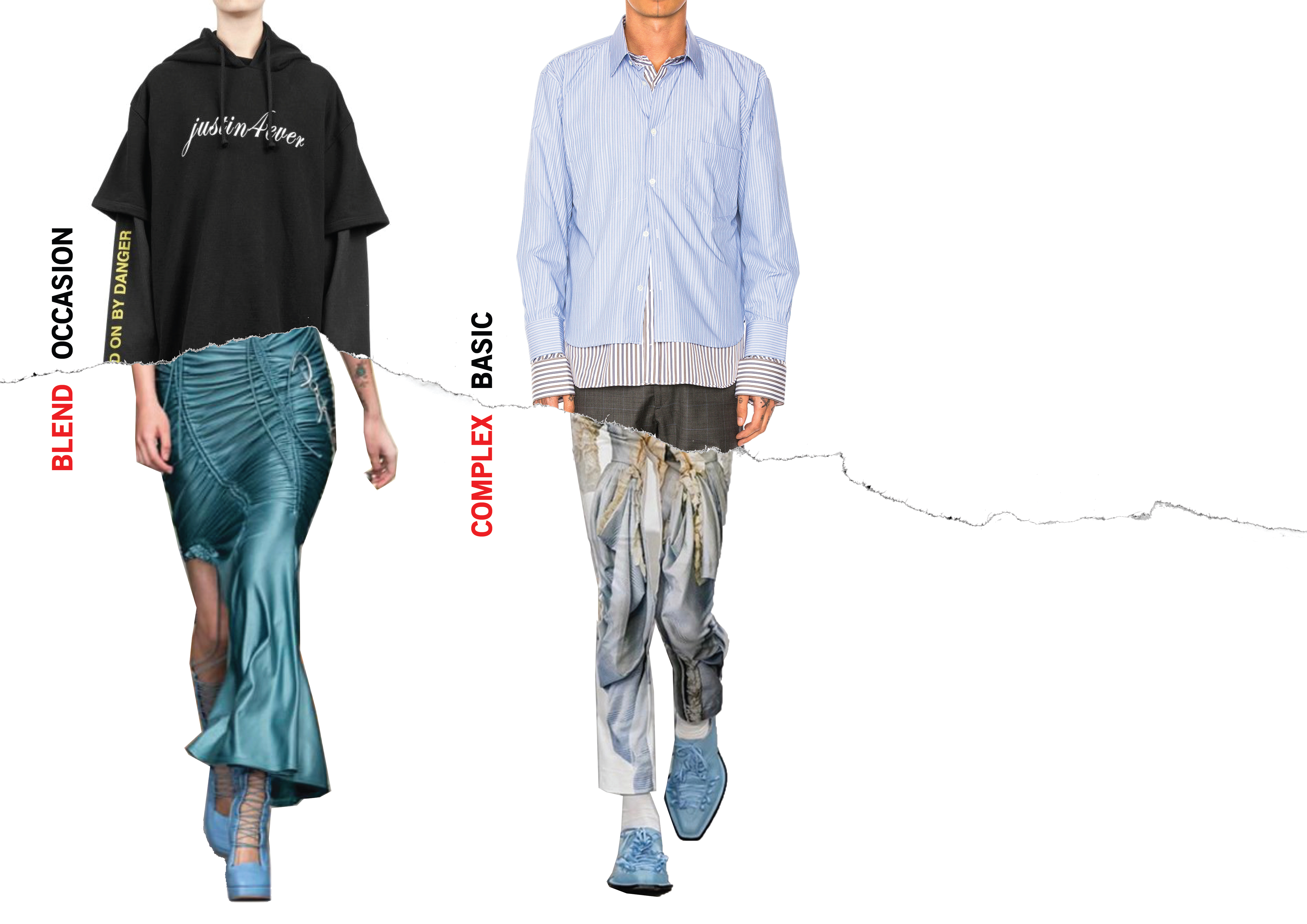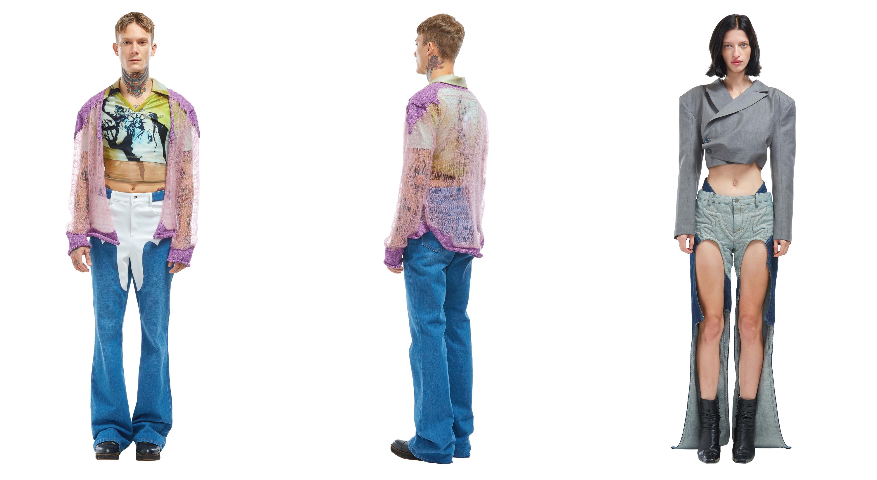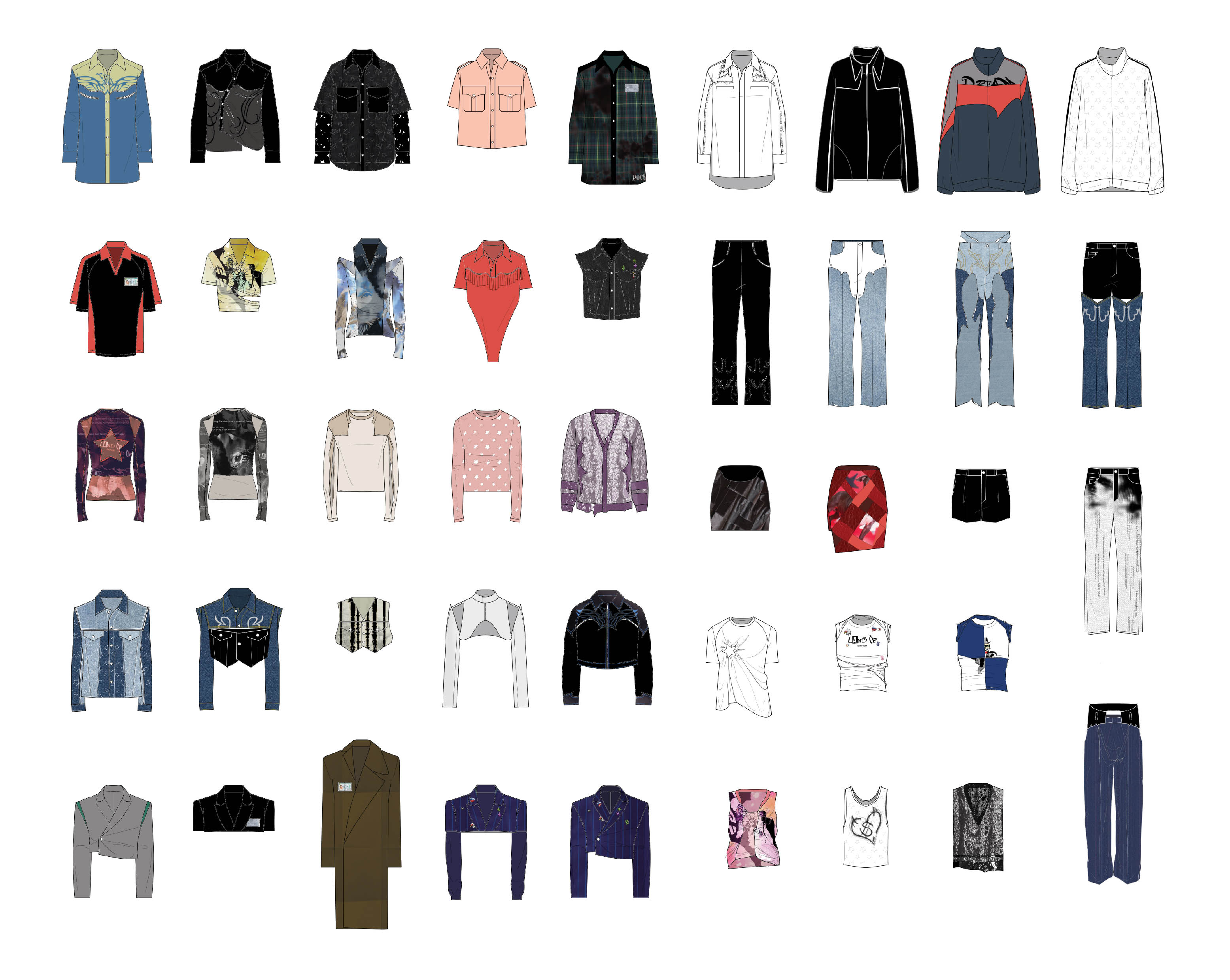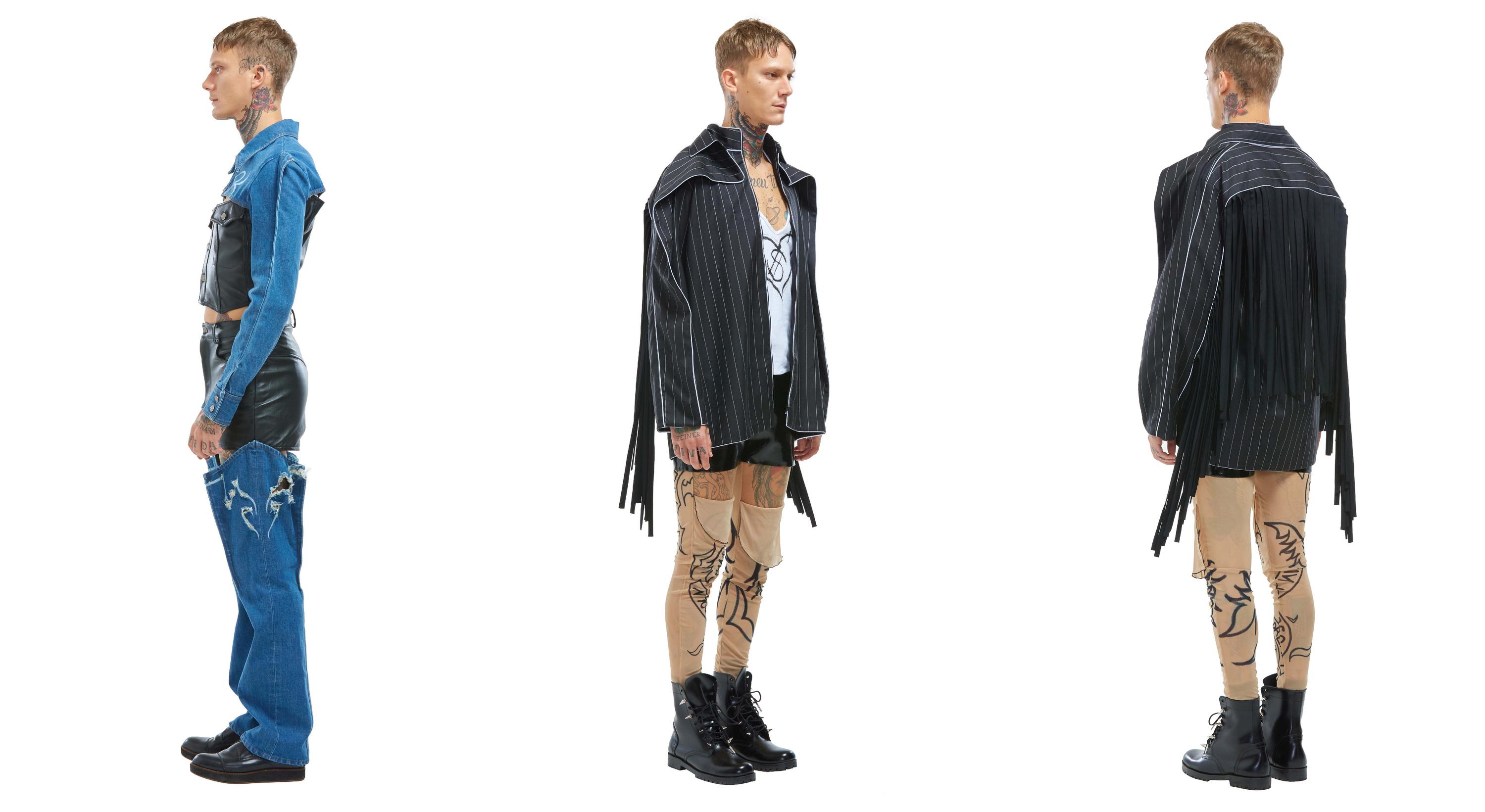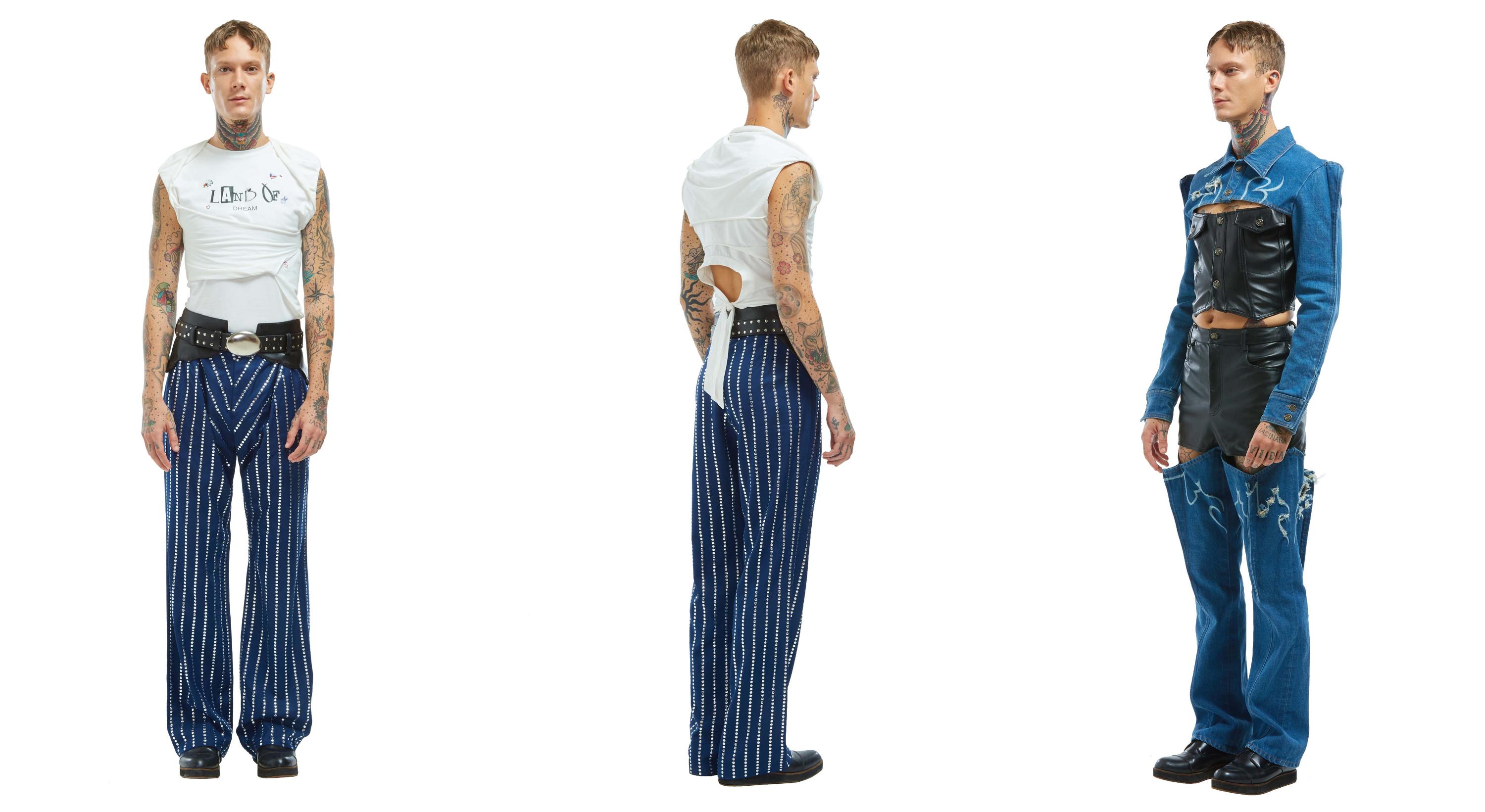 It becomes a raw-edge tanktop, stud-stripe flare slack pants, vaquero-curve cutting jeans, and so on.